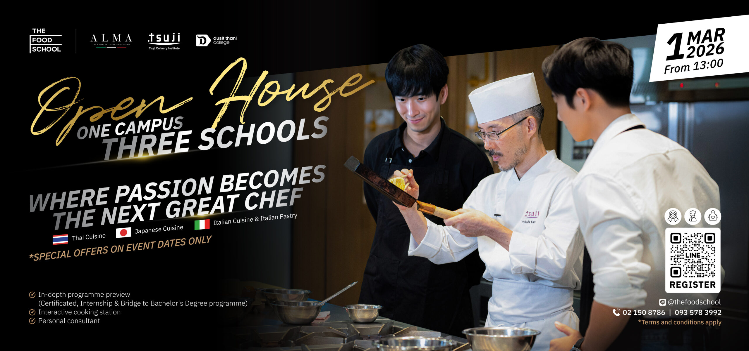 หลักสูตรของเราได้รับการออกแบบมาเพื่อให้สอดคล้องกับสถานการณ์ในวงการอาหารปัจจุบัน โดยร่วมมือกับสถาบันพาร์ตเนอร์ ได้แก่ โรงเรียนสอนทำอาหารอิตาเลียน ALMA โรงเรียนสอนทำอาหาร Tsuji และวิทยาลัยดุสิตธานี มุ่งเน้นการฝึกอบรมโดยมอบทักษะในระดับสูงสุด ให้คุณได้เลือกเรียนทำอาหารที่คุณสนใจกับหลักสูตรการศึกษาด้านการทำอาหารที่ได้รับการยกย่องในระดับโลกจากสถาบันพาร์ตเนอร์ของเรา